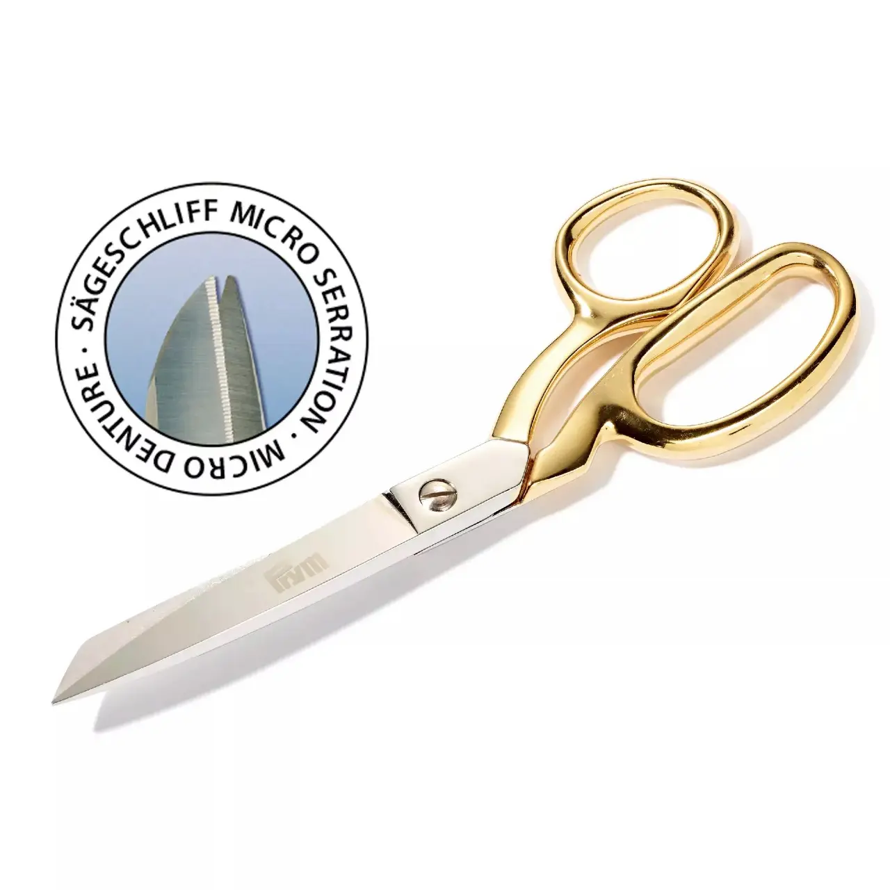 З цими ножицями все, що блищить – справжнє золото. Професійні кравецькі ножиці особливо ефектно виглядають завдяки сталевим ручкам з мерехтливим золотим покриттям. Модель Gold Edition доповнює серію Classic. Портнівські ножиці виготовлені методом гарячого кування з високоякісної сталі, заточені вручну та пройшли ретельну перевірку якості.Особливістю блискучих сталевих лез є зубчасте заточування, яке оптимально запобігає ковзанню під час роботи з делікатними тканинами, такими як шовк або синтетичні волокна.