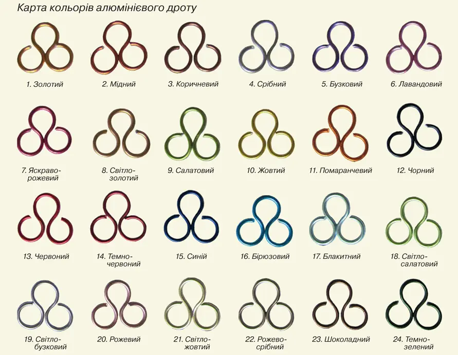 Художній дріт має великий вибір яскравих та блискучих кольорів та розмірів. Едине обмеження у роботі з кольоровим дротом це Ваша уява.