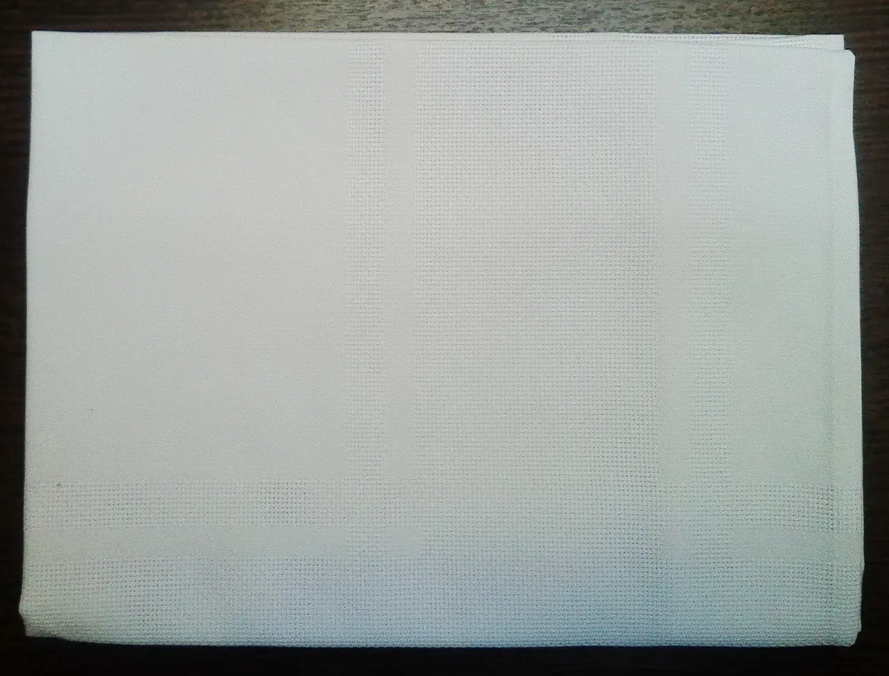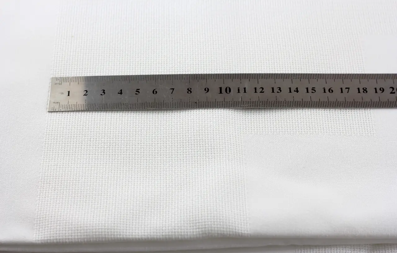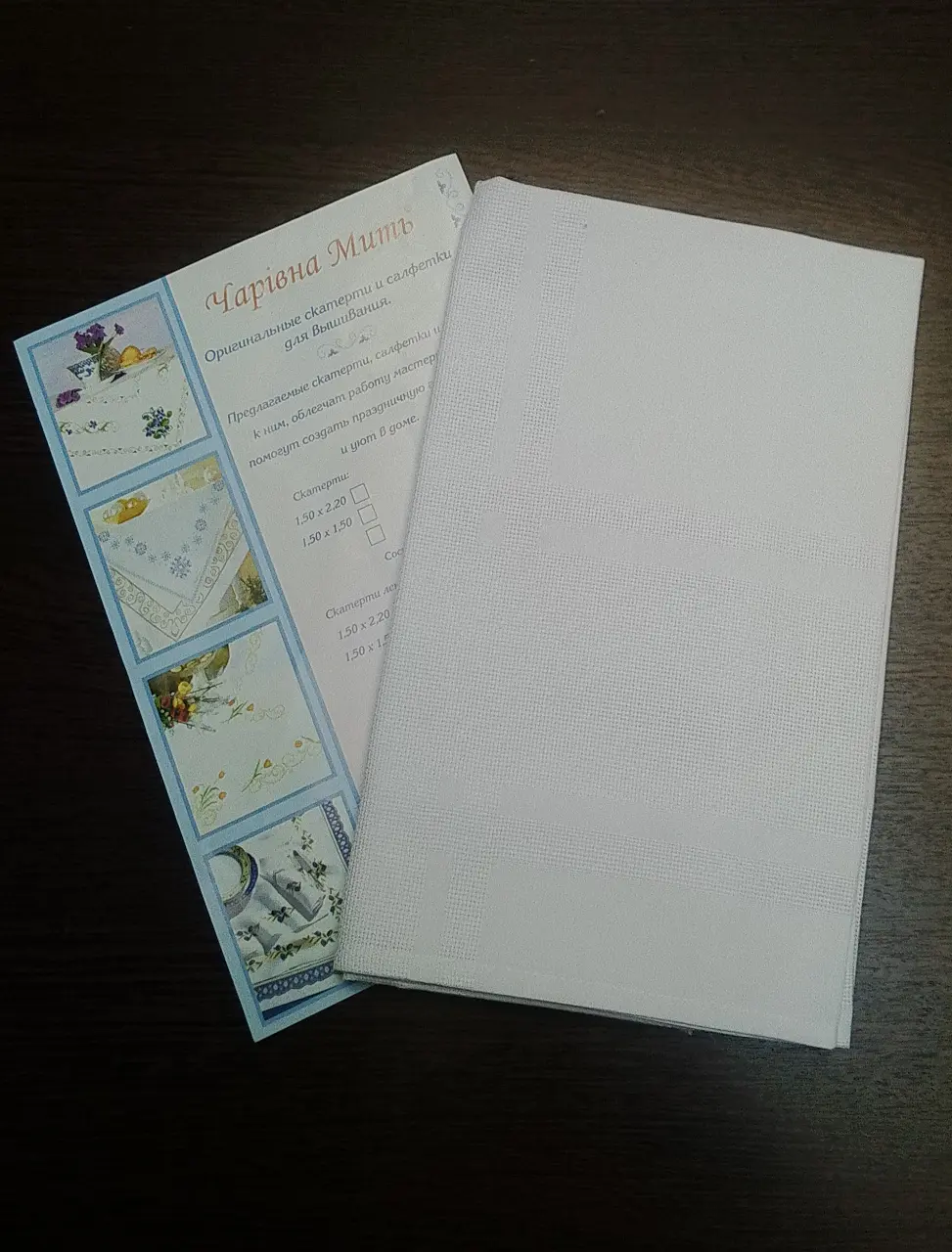 Готова біла скатертина для вишивання (вставки для вишивання розташовані так, як показано на малюнку). Зашивається квадратна область по центру та периметр.