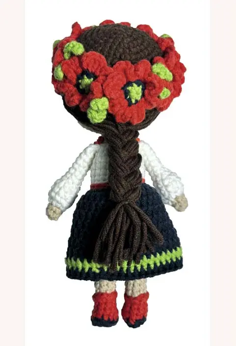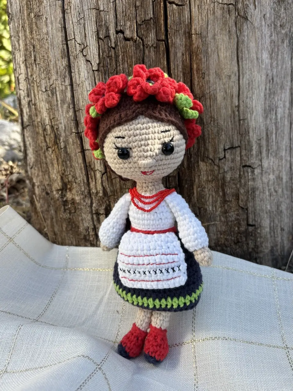 Лялька має традиційний український образ: вишиванку, спідницю, віночок із квітами та стрічками, що підкреслює національний колорит. Така іграшка стане чудовим подарунком або декоративним елементом, який відображає українську культуру.