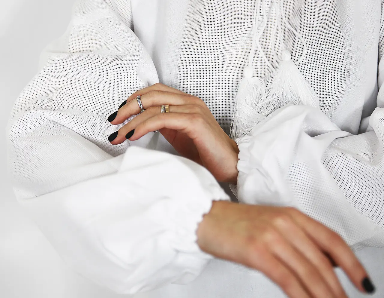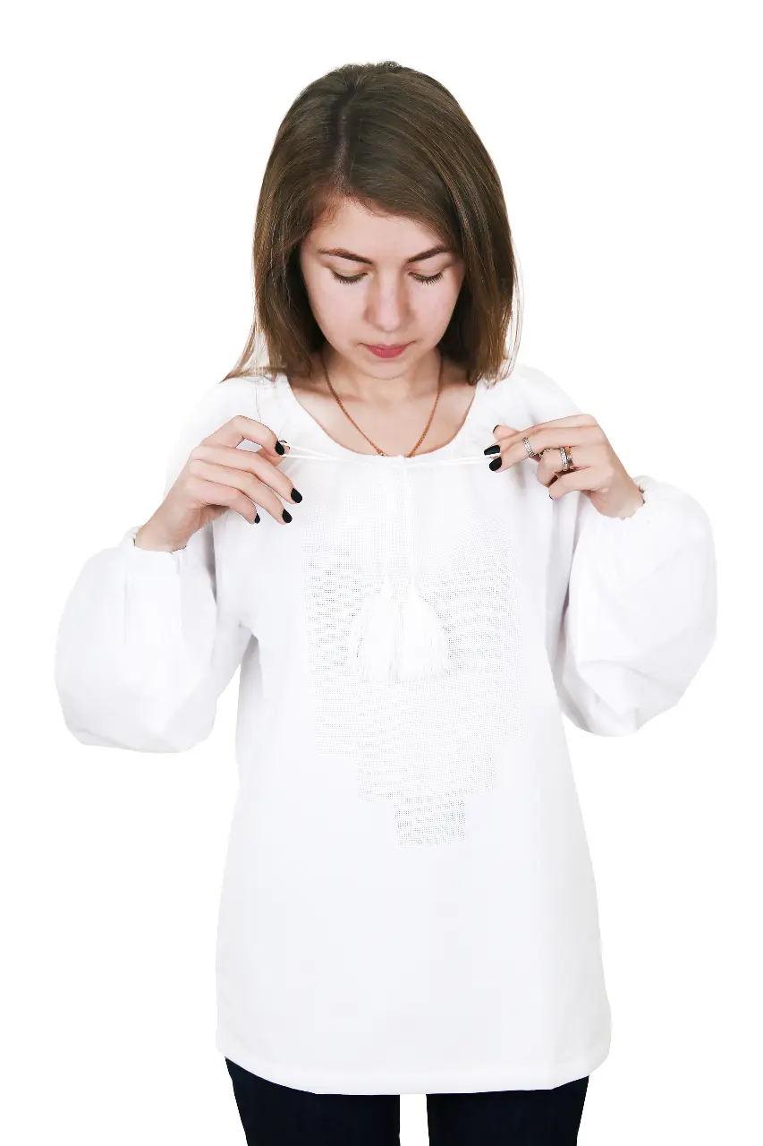 Домотканна жіноча сорочка зі вставками під вишивку бісером, намистинами TWIN та стразами. Вставки розташовано так, як зображено на малюнку. Сорочка чорного кольору з довгим рукавом.
